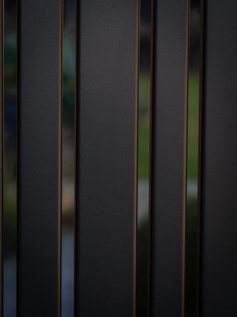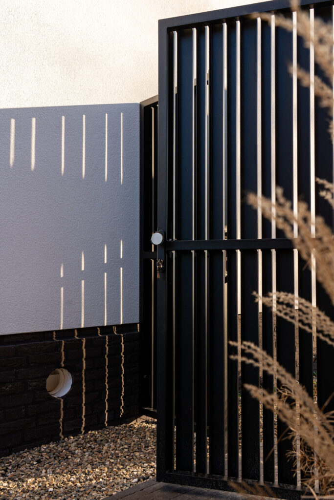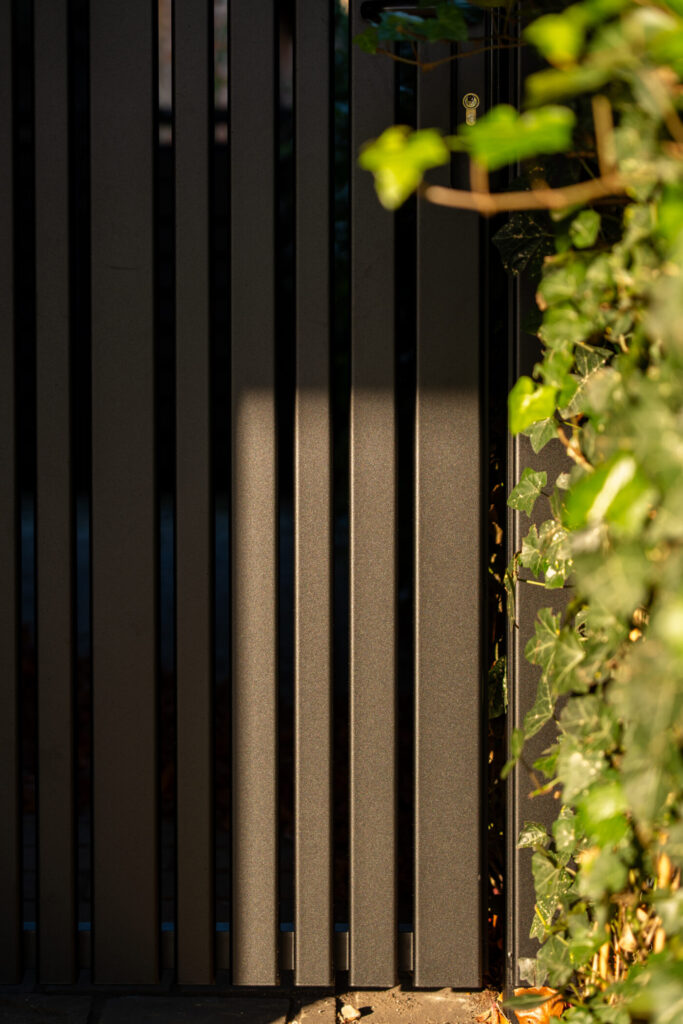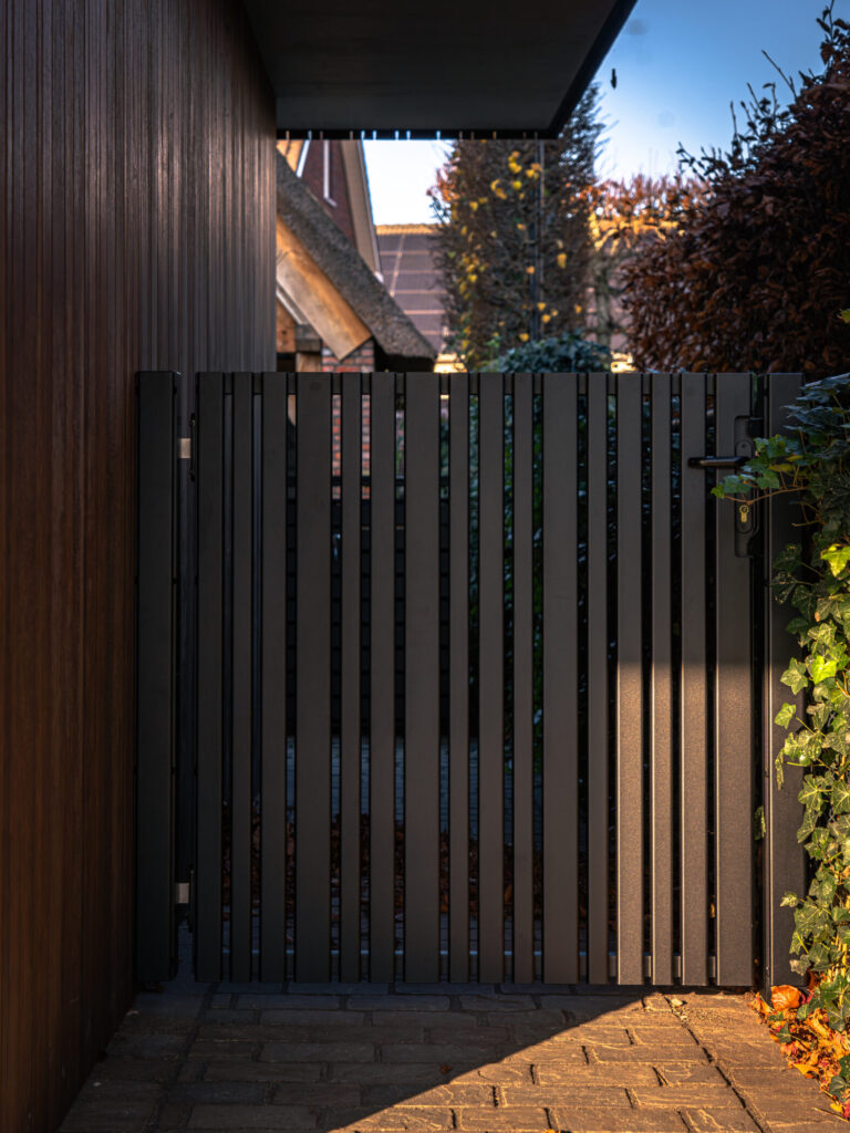 Het lijnenspel met verticale profielen in wisselende breedtes sluit naadloos aan op de geveldetails van de woning. De poorten vormen daardoor geen los element, maar versterken het totaalontwerp.