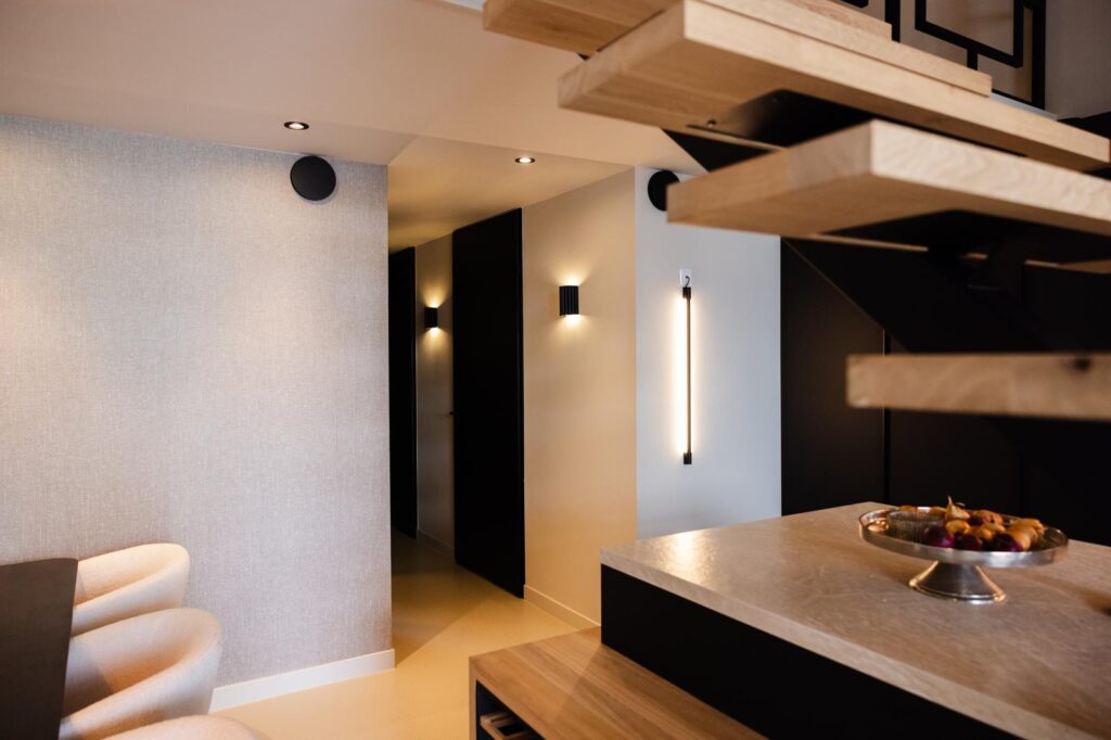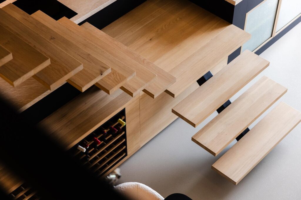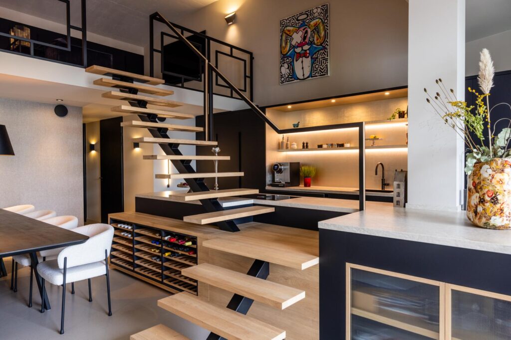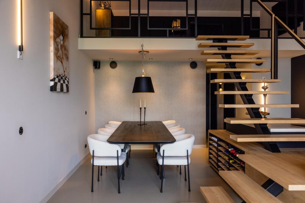 Bijzonder aan dit project is de handregel die vloeiend doorloopt van de trap naar de videhekwerken. Hierdoor ontstaat één doorlopend lijnenspel dat zorgt voor samenhang in het interieur.